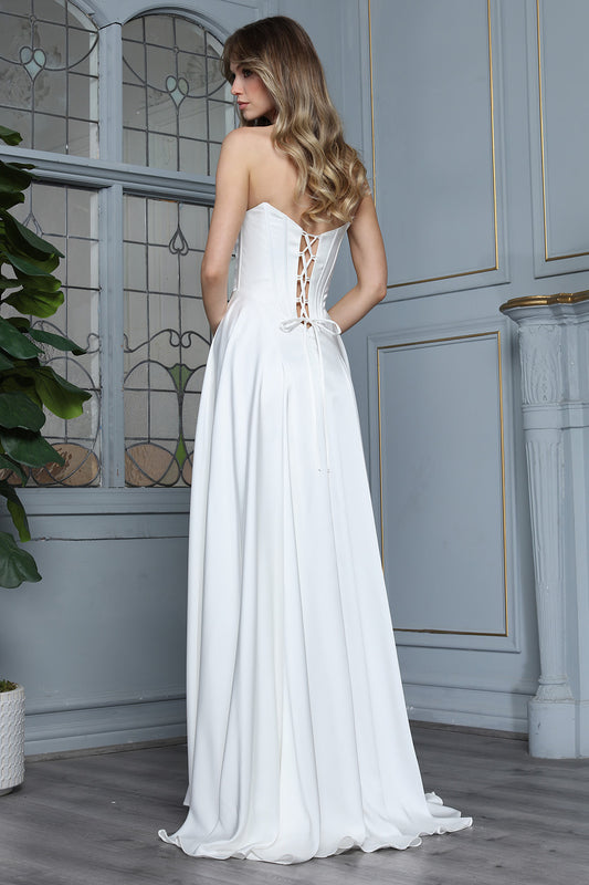 Vetido de Novia en corte A de satén y con Escote Corazon color Off White.