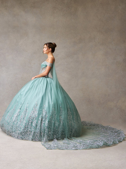 Vestido XV Años de tul con Purpurina, Lentejuelas Con Capa (Dos Colores)
