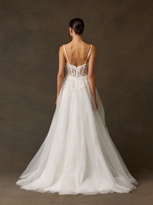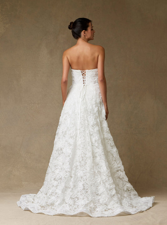 Vestido de Novia Línea A con Bordado de Lentejuelas y Perlas color Off White.