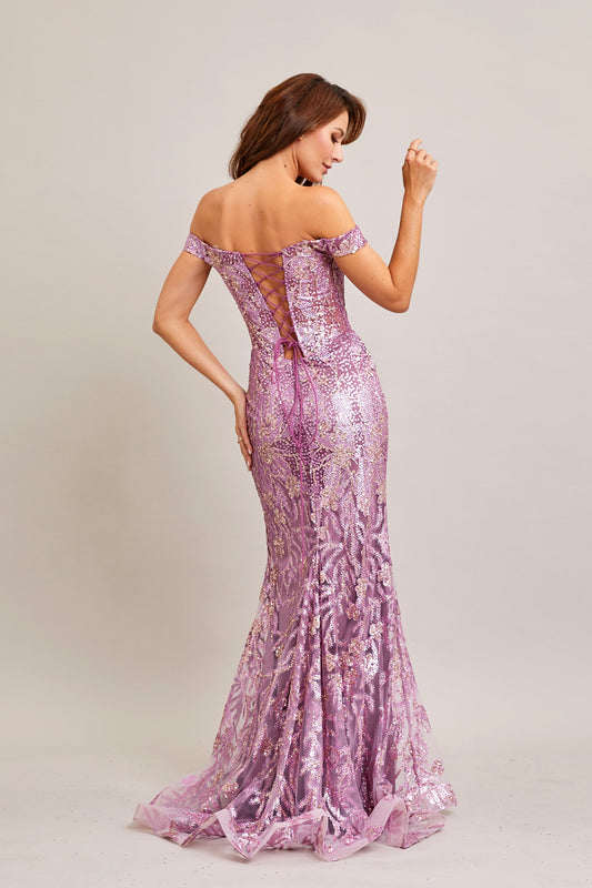 Vestido con Hombros Descubiertos con Tul Bordado con Brillo y Lentejuelas, Color Dark Mauve