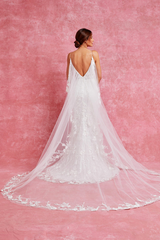 Vestido de Novia Corte Sirena, Cuello en V y Tirantes, Espalda Descubierta con Capa Larga, Color Off White.