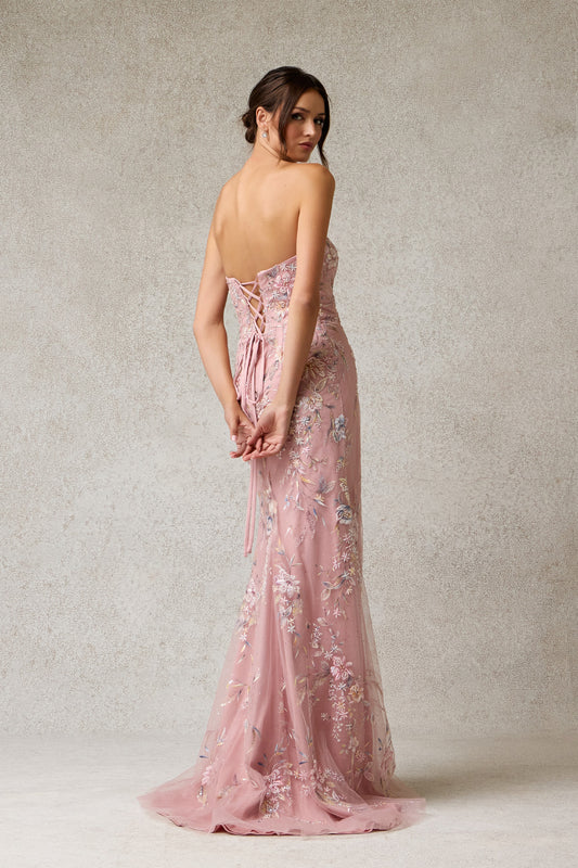 Vestido de Tul Bordado con Encaje Floral, Escote Corazón y Abertura en la Pierna, Color Blush