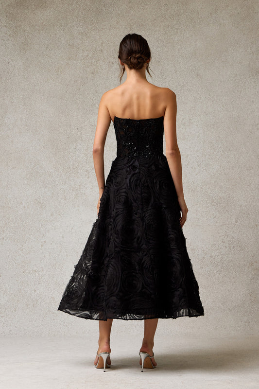 Vestido Corte Midi en A de Tul con Encaje, Cuentas, Lentejuelas y Perlas, Color Black