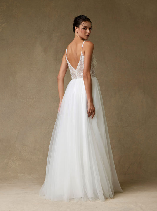 Vestido de Novia en Corte A, de Tul con Aplicaciones de Cuentas, Lentejuelas y Perlas, Con Tirantes y Cuello en V, Color Off White