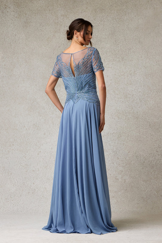 Vestido Corte en A, Manga Corta, Escote en V, Bordado con Cristales y Lentejuelas, Color Ice Blue