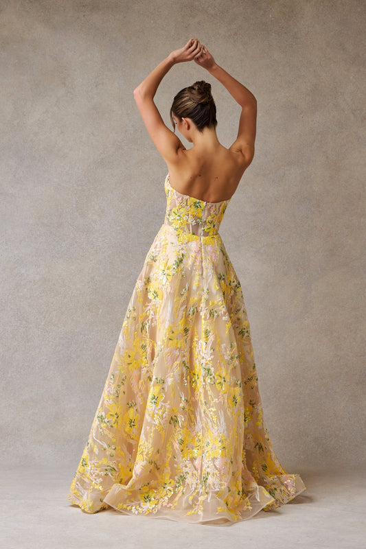 Vestido Corte A Sin Tirantes y Escote Corazón Color Yelow Print.