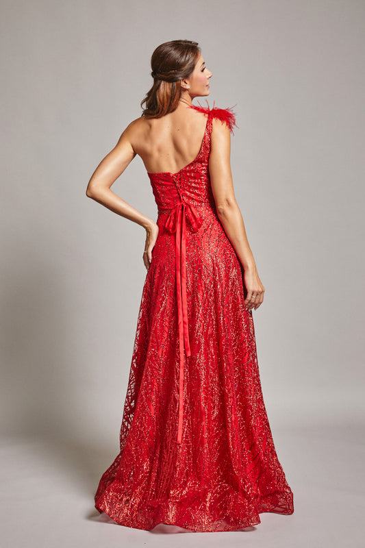 Vestido Corte en A Bordado con un Hombro y Aplicaciones con Plumas, Colores Red y Royal