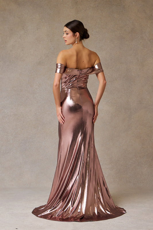 Vestido Corte Sirena Metalizado con Hombros Descubiertos y con Abertura en la Pierna Color Bronze.