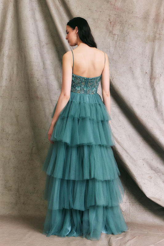 Vestido en Línea A sin Tirantes y escote en Corazón. Color Dusty Teal.
