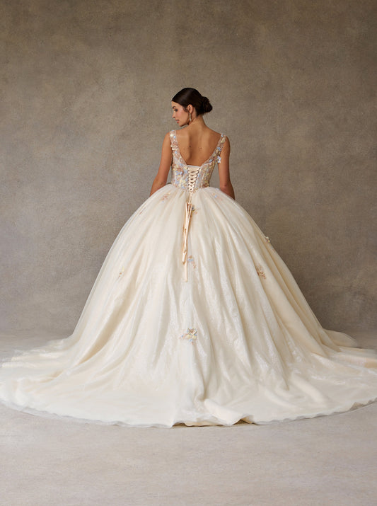 Vestido de Fiesta con Tirantes con Aplicaciones de Flores y Perlas, Color Champagne Multi