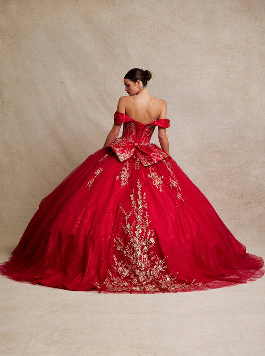 Vestido de Fiesta con Hombros Descubiertos de Encaje Bordado con Brillos Cristales y Lentejuelas, Color Red Gold