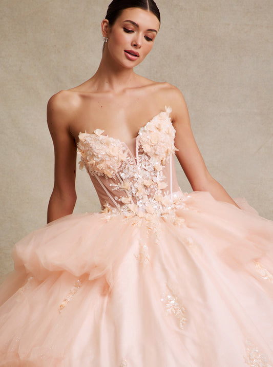 Vestido de Fiesta con Mangas Desmontables con Aplicaciones en Cuentas, Lentejuelas y Flores en 3D, Color Peach