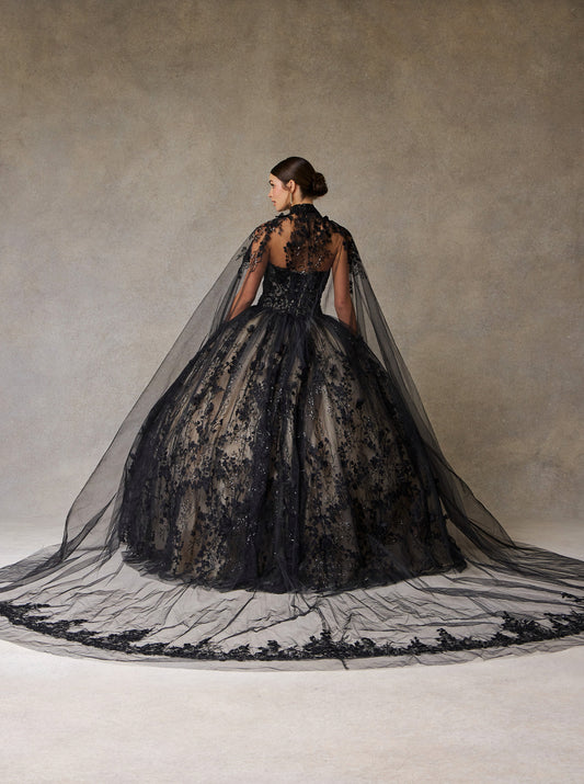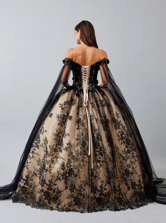 Vestido de Fiesta con Escote de Corazón y Aplicaciones en Flores con Capa tipo Velo, Colores Black-Nude y Ligth Pink