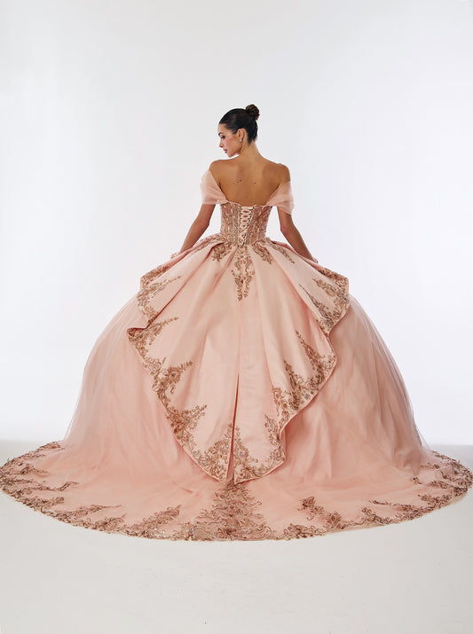 Vestido de Fiesta con Hombros Descubiertos y Escote de Corazón, de Tul Bordado con Brillos, Lentejuelas y Cuentas, Color Rose Gold.