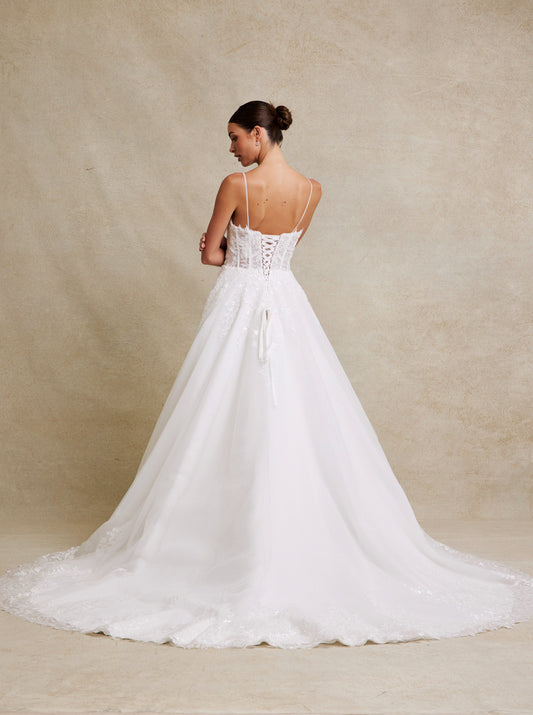 Vestido de Novia con Tirantes de Tul con Encaje Bordado con Cuentas y Lentejuelas, Color Off White