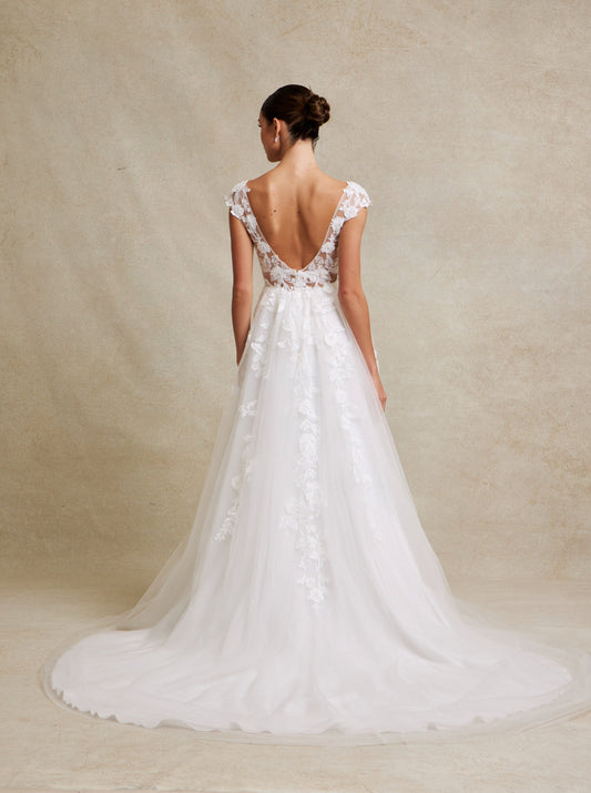 Vestido de Novia Con Manga Corta, Encaje y Tul.