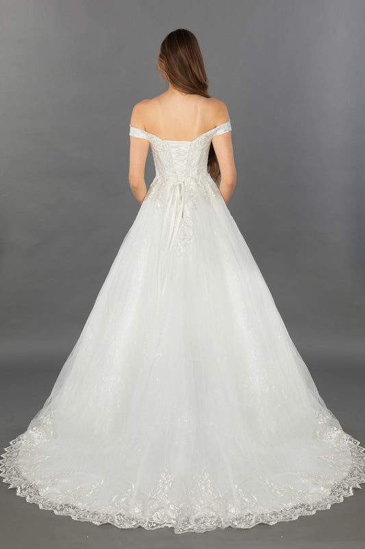 Vestido de Novia Corte en A al Hombro de Tul con Brillo y Bordado con Lentejuela, Color Off White