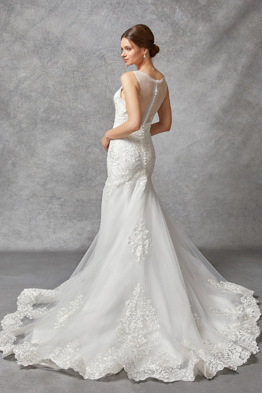 Vestido de Novia Corte Sirena de Tul Bordado y Espalda con Botones. Color Off White