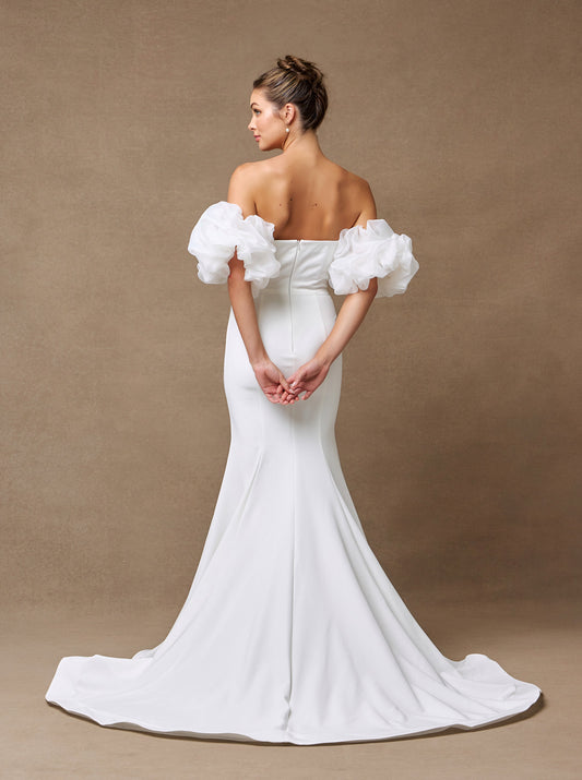 Vestido de Novia Corte Sirena sin Tirantes y Mangas Color Off White.
