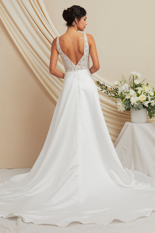 Vestido de Novia en Corte A con Tirantes, Escote en V con Encaje en la Parte Superior Color Off White