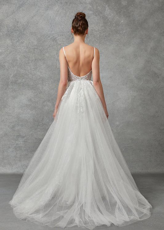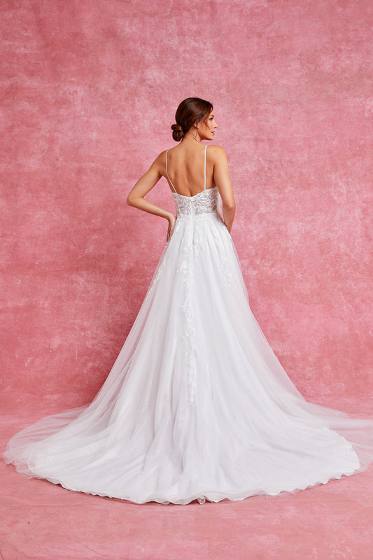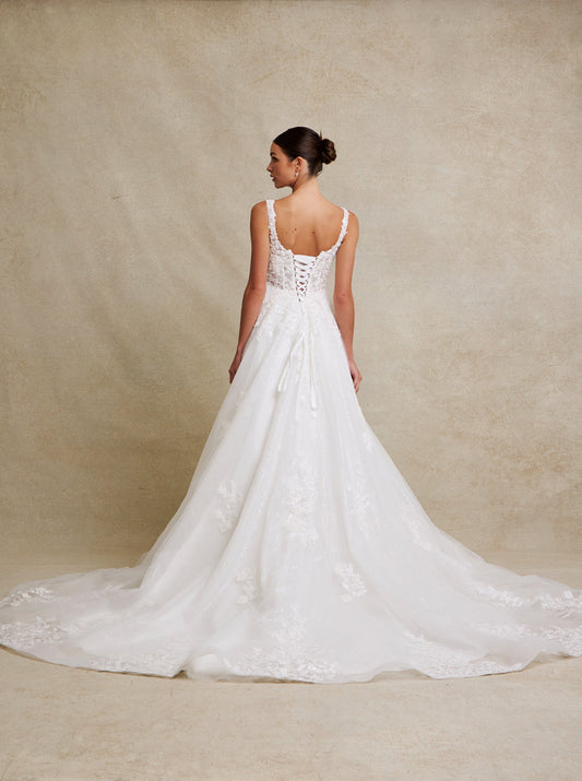 Vestido de novia en corte A con tirantes de encaje