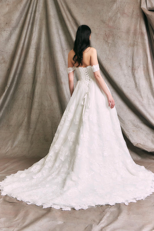Vestido de Novia en Corte A con Aplicaciones Florales en 3D de Yvaine Gown, Color Off White Nude