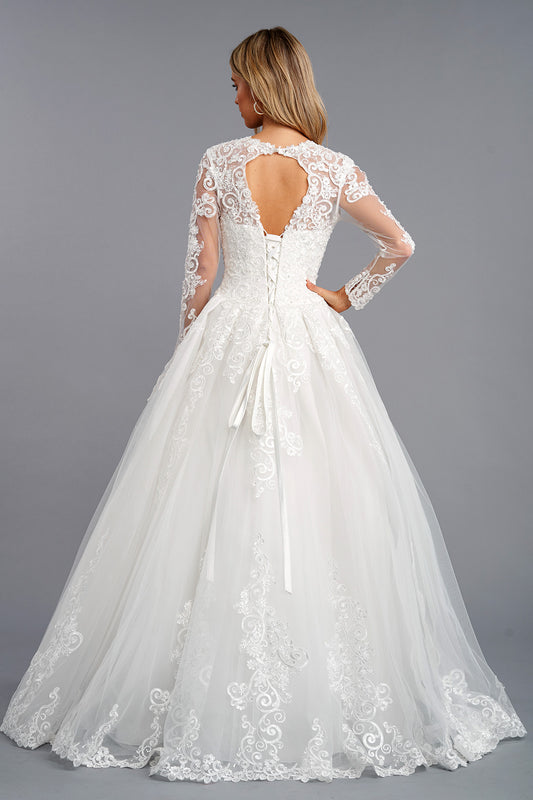 Vestido de Novia en Corte A Manga Larga con Aplicaciones en Encaje Color Off White