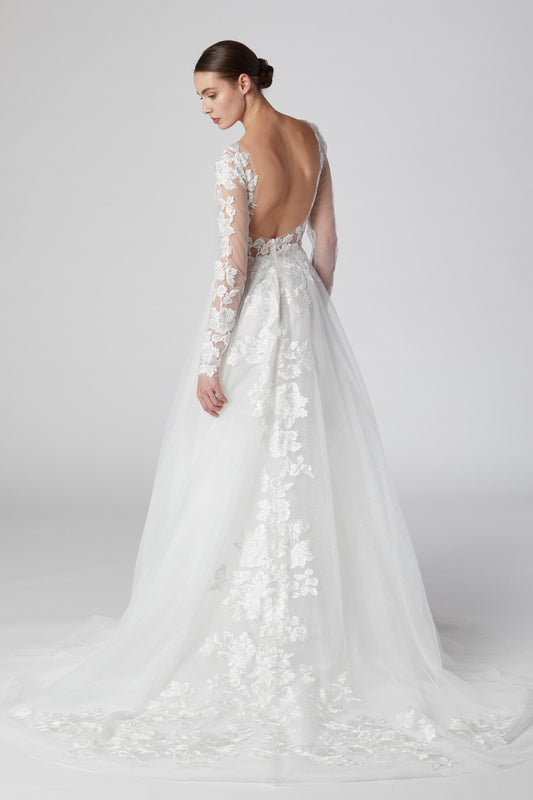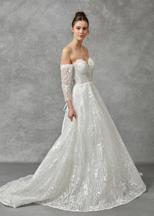 Vestido de Novia Escote ilusión con hombros descubiertos, apliques florales y mangas drapeadas transparentes.