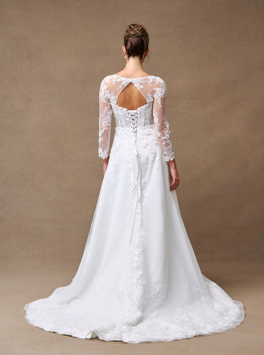 Vestido de Novia Línea A Con Mangas Largas con Tipo Corse y Espalda con Cordones Color Off White.