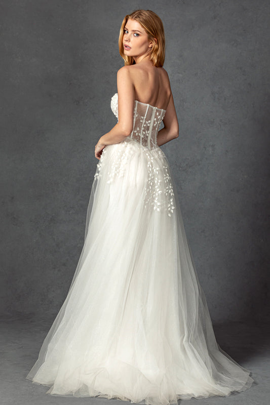 Vestido de Novia Líne A a Capas con decoraciones en Encaje Sin Hombros y con abertura Color Ivory.