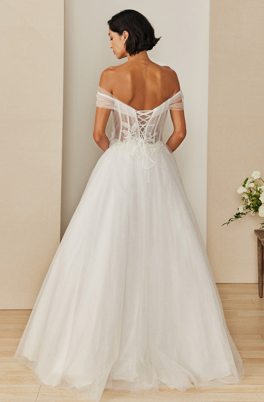 Vestido de Novia Hombros Fuera, Codones en la Espalda y Escote de Corazón.