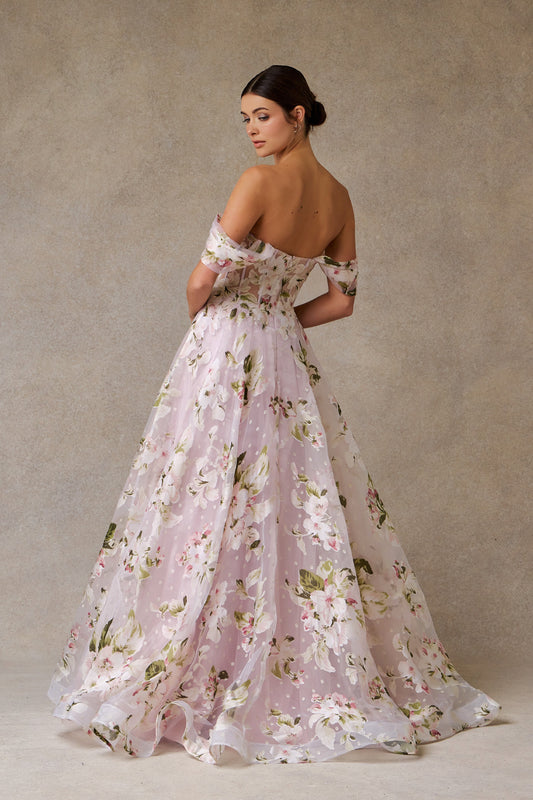 Vestido de Organza en Corte A con Hombros Descubiertos, Color Blush Print