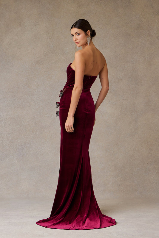 Vestido de Terciopelo Corte Sirena Escote Corazón y Abertura en la Pierna Color Wine.