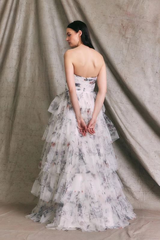Vestido con Corse en Línea A y Strapless Color White Print.