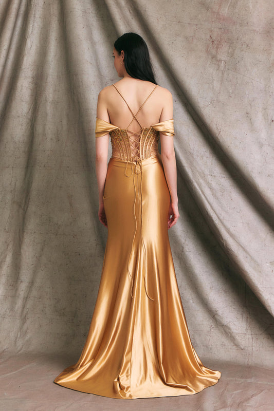 Vestido Con Abertura Escote Forma de Corazón Espalda con Cordones y Hombros Desmontables Color Gold.