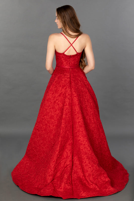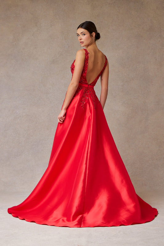 Vestido en Corte A Cuello en V con Bordados Florales, Lentejuelas y Cuenta, Color Red