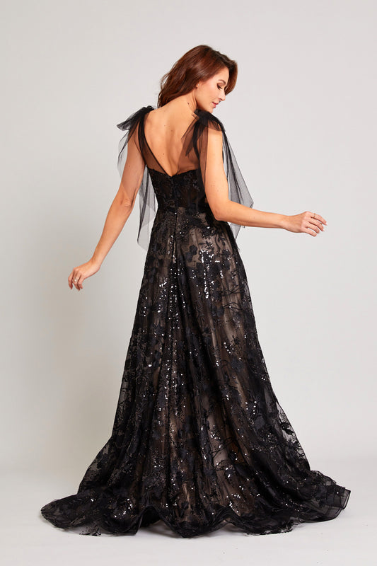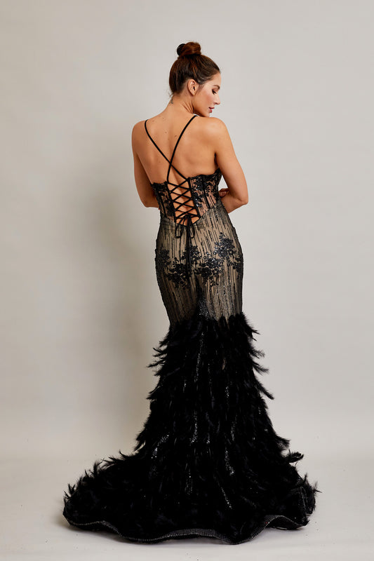 Vestido Sin Mangas en Línea A. escote en Corazon y con Cola Color Black Nude.