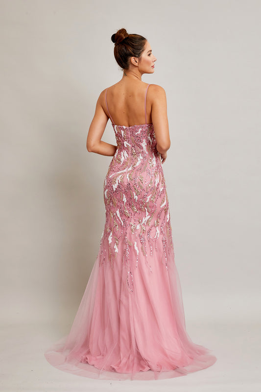 Vestido rosa con escote corazón aplicaciones y encaje floral, sin mangas brillante. Color Blush