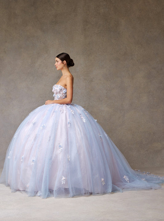 Vestido de Fiesta con Brillos Escote de Corazón Aplicaciones en Flores en color Ligth Blue Pink