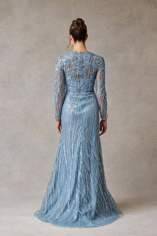 Vestido de Tul a Capas de Encaje con Decoraciones Color Smoky Blue.