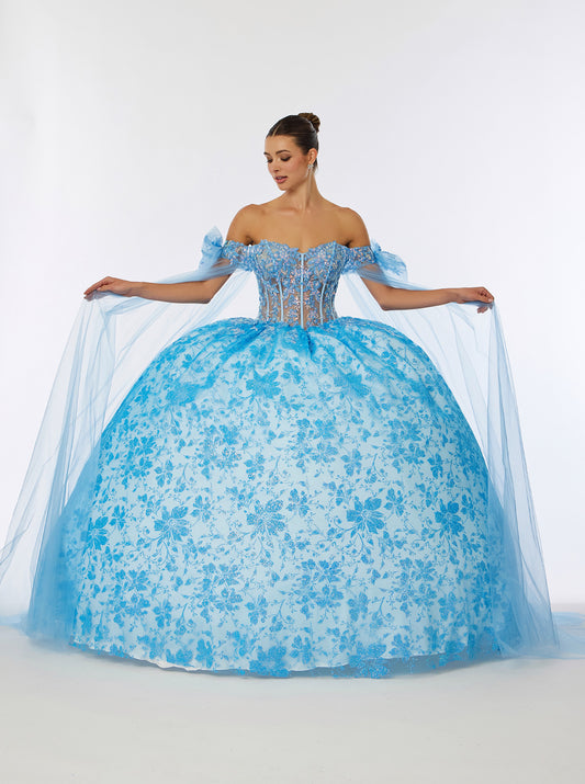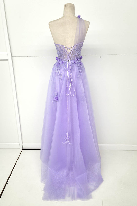 Vestido Corte A con un Hombro al Descubierto, Corsé Semitransparente con Encaje y Flores. Colores Lilac y Baby Blue