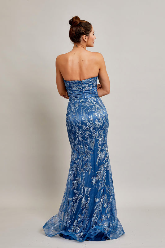 Vestido de noche corte A sin tirantes y apliques florales color smoky blue