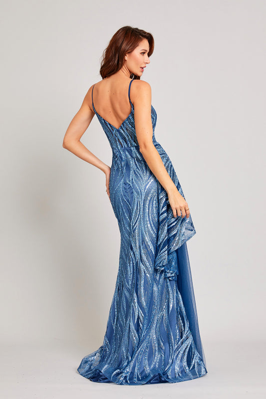 Vestido de noche corte ajustado con lentejuelas y cordones en la espalda color OCEAN BLUE