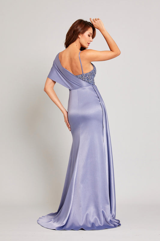 Vestido con un Hombro Escote en Corazón y con Apertura Color Smokey Blue.