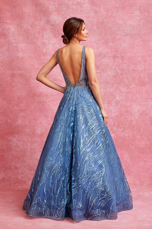 Vestido de noche corte ajustado con un patrón de cuentas de platino por todo el vestido color lt blue