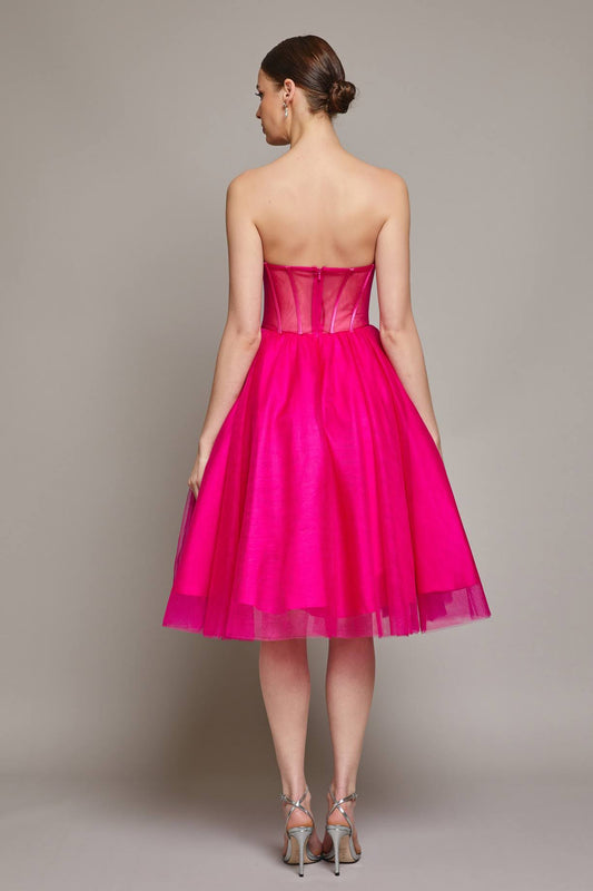 Vestido Corto sin Hombros y Corse Color Fuchsia.