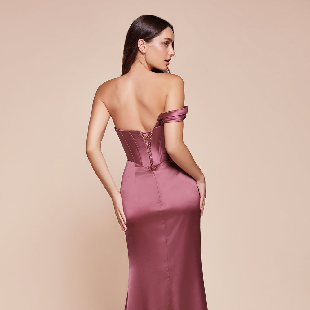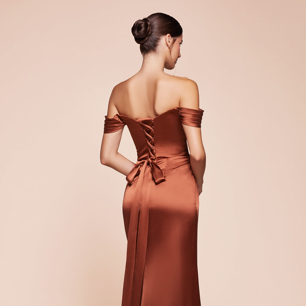 Vestido de Satén Corte Recto con Abertura en la Pierna y Hombros Descubiertos (Varios Colores)