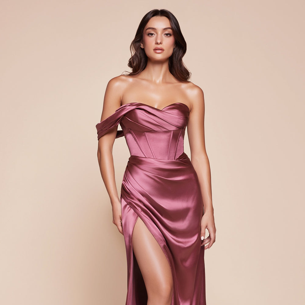 Vestido de Satén con Hombros Descubiertos, Escote Drapeado y Abertura en la Pierna (Varios Colores)
