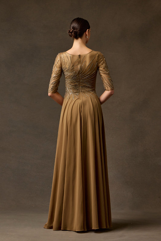 Vestido Corte en A, Cuello en V, Manga 3/4 y Aplicaciones de Cuentas en el Corpiño, Color Bronze