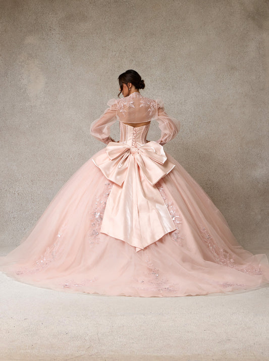 Vestido de Fiesta, Escote Corazón, Lazo Desmontable y Bolero de Manga Larga, Color Blush